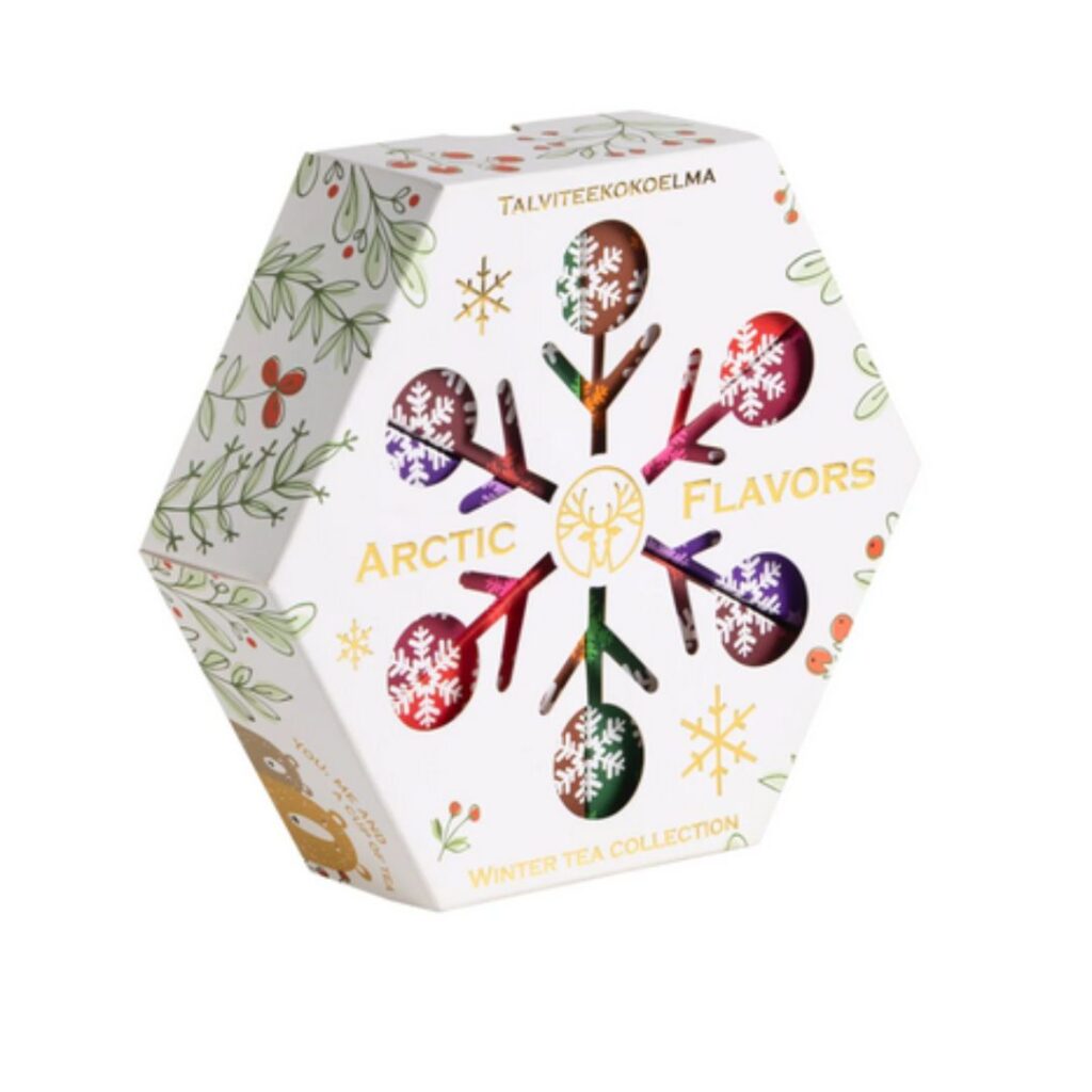 Kalenterissa on 25 luomuteepussia, joten teematka jatkuu aina joulupäivään asti. Maut vaihtelevat sesongin klassikoista mausteisiin ja hedelmäisiin yllätyksiin. Mukana on esimerkiksi: