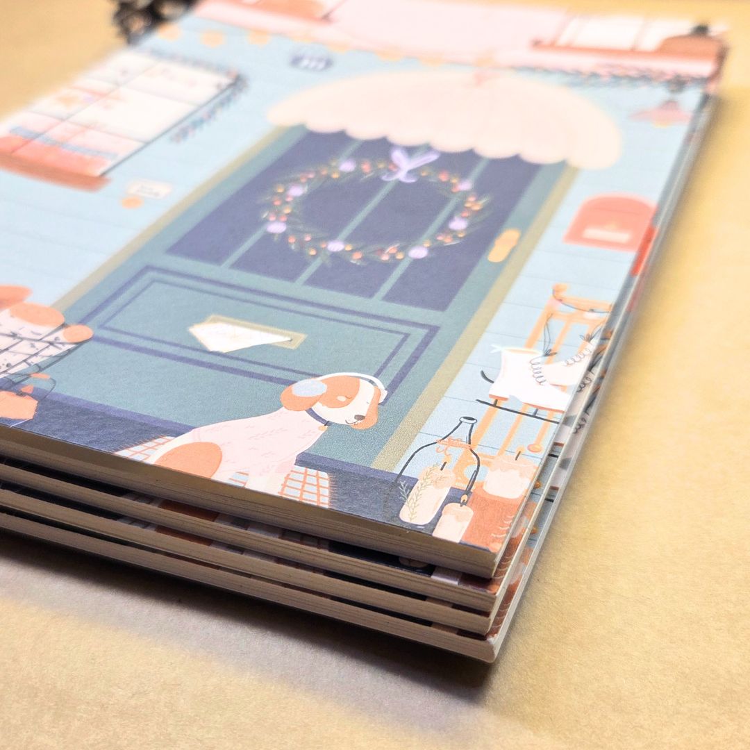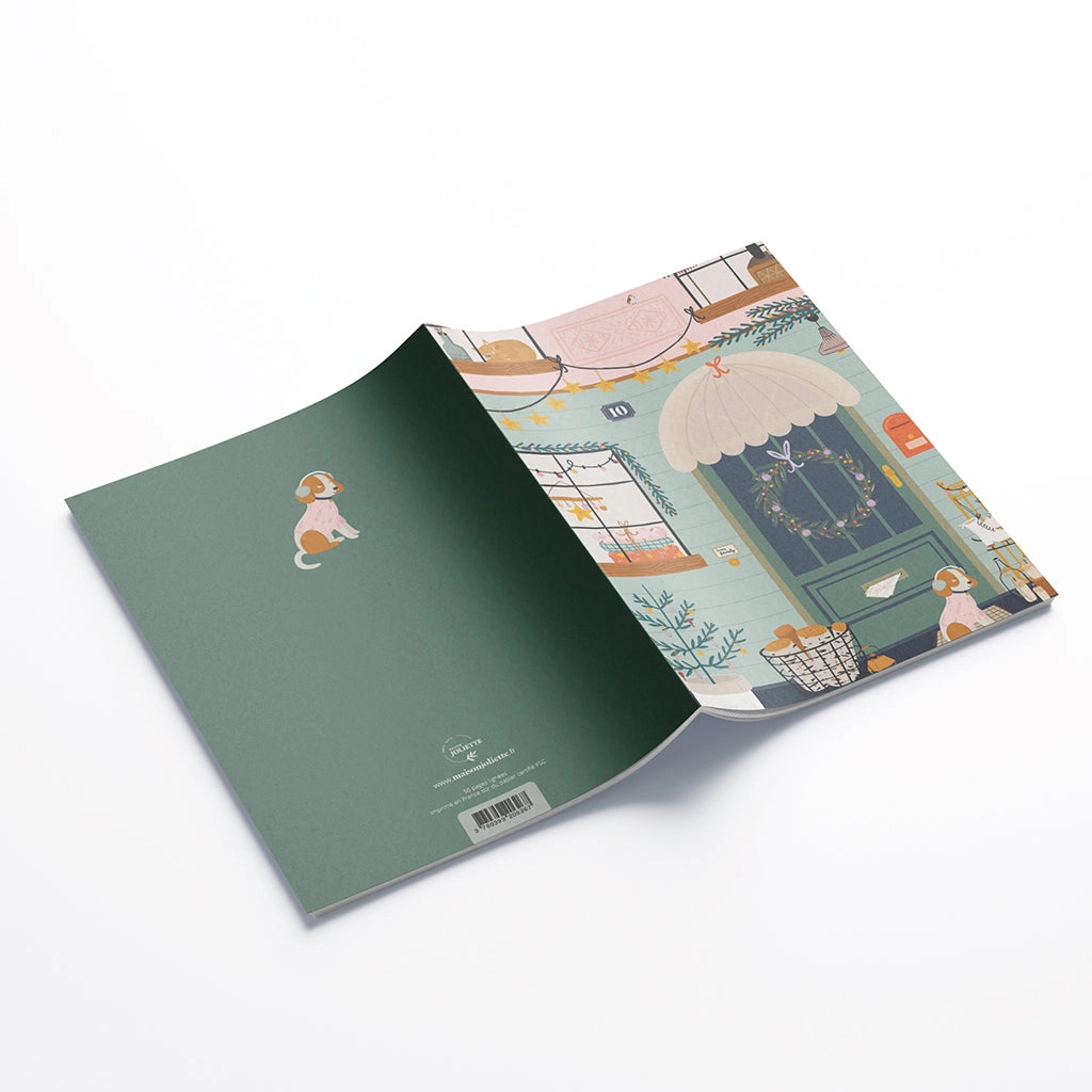 Tämä kaunis A5-kokoinen muistikirja tuo joulun tunnelman arkeen iloisella ja tarinallisella tavalla. Good Luck Charm -kuvituksessa avautuu kodikas julkisivu, jonka jouluinen koristelu kutsuu pysähtymään: ovessa on kranssi, ikkunaa kehystävät havut ja tähdet, ja pienet yksityiskohdat herättävät mielikuvia rauhallisista joulupäivistä. Kuvitus vie ajatukset hetkeksi pois kiireestä ja palauttaa joulun lämpimät muistot mieleen. Muistikirjan taustapuolellakin on suloinen, piirretty koirakuvitus 🐾
