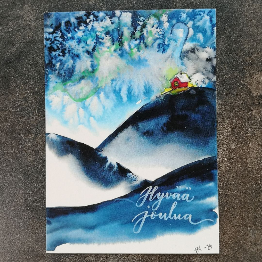 Tämä maalattu kortti on Hennapaulina_artin teos ja Hyvää joulua -tekstin on korttiin kirjoittanut Handmade Pihlaja, kuusamolaisia harrastetaiteilijoita molemmat.