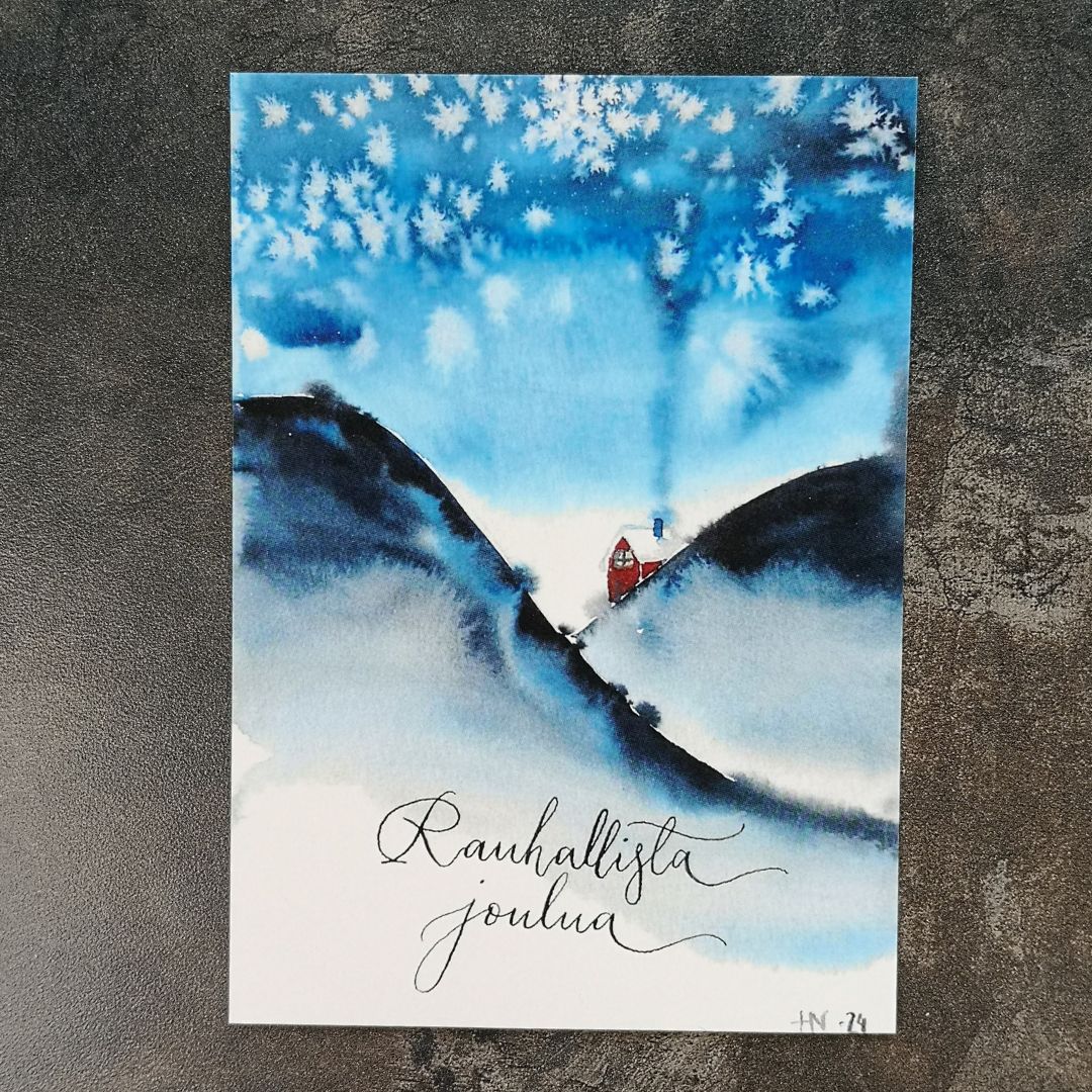 Vesivärein maalattu kortti on kuusamolaisen harrastetaiteilija Hennapaulina_artin teos. Niin ikään kuusamolainen kalligrafiaharrastaja Handmade Pihlaja on kirjoittanut korttiin kauniin Rauhallista joulua -toivotuksen.