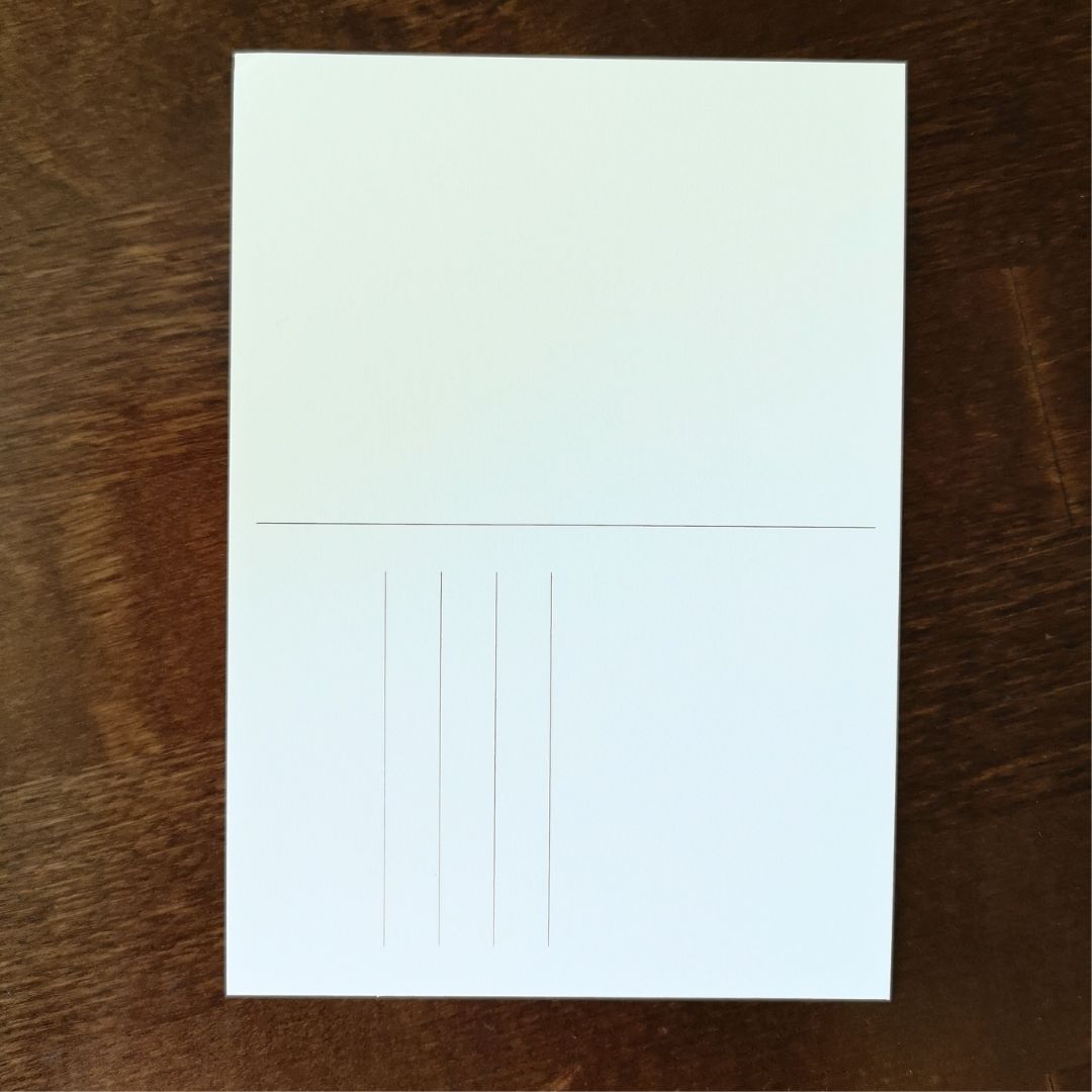 Kortin kääntöpuoli on mattapintainen, johon on helppo kirjoittaa. Sieltä löytyy neljä viivaa vastaanottajan nimi- ja osoitetietoja varten.