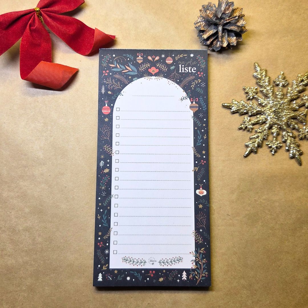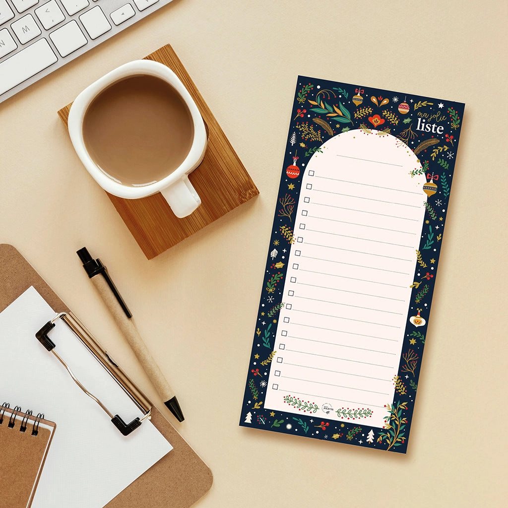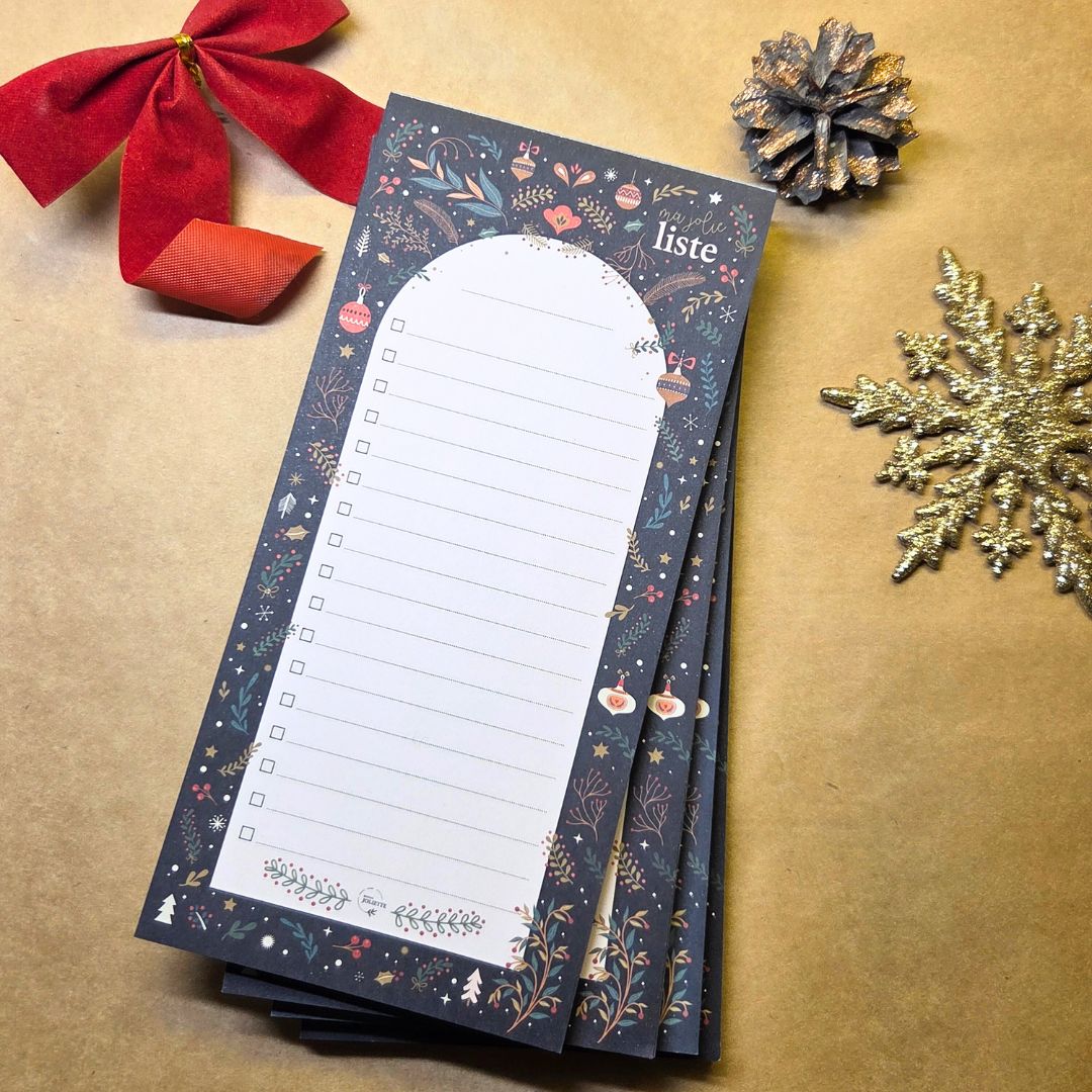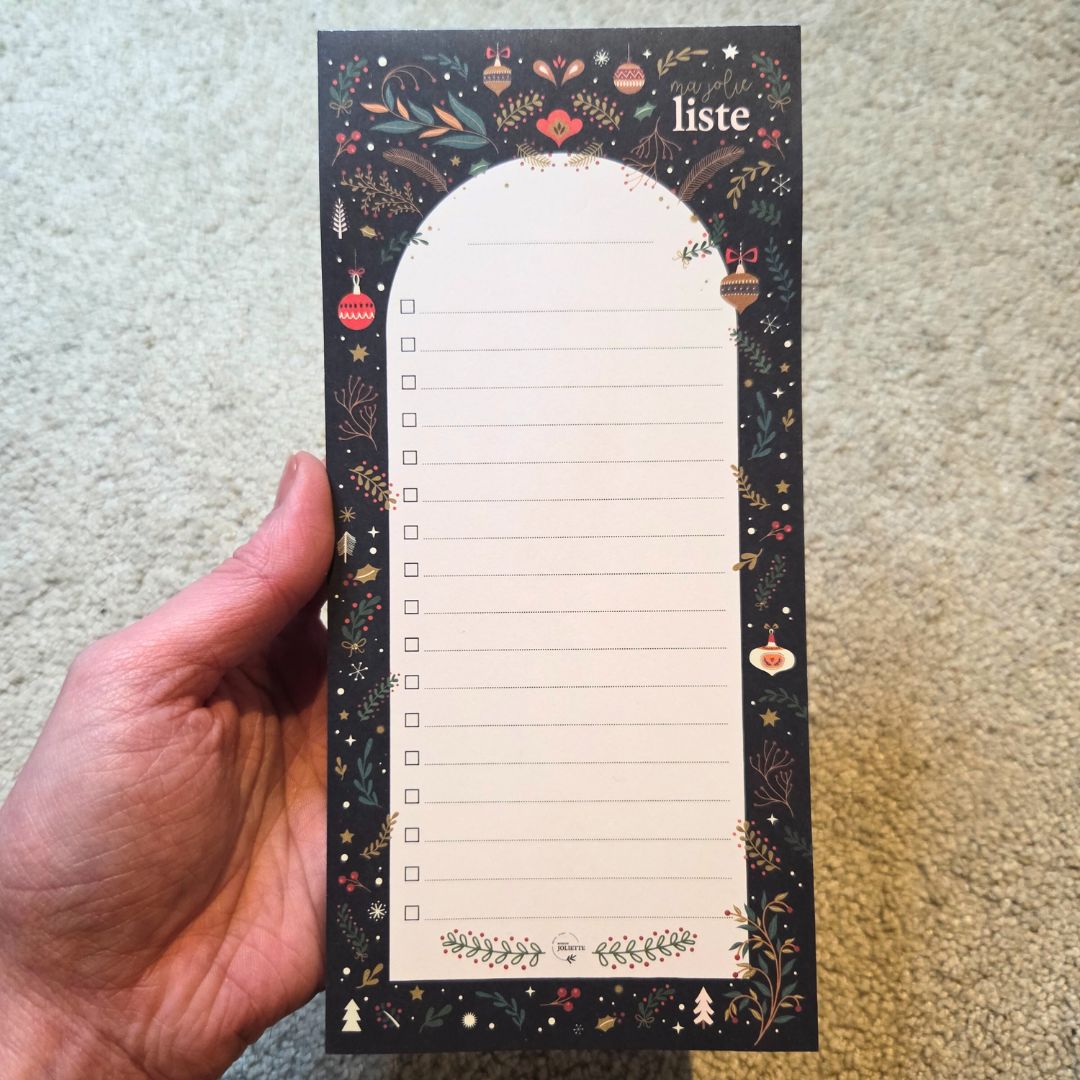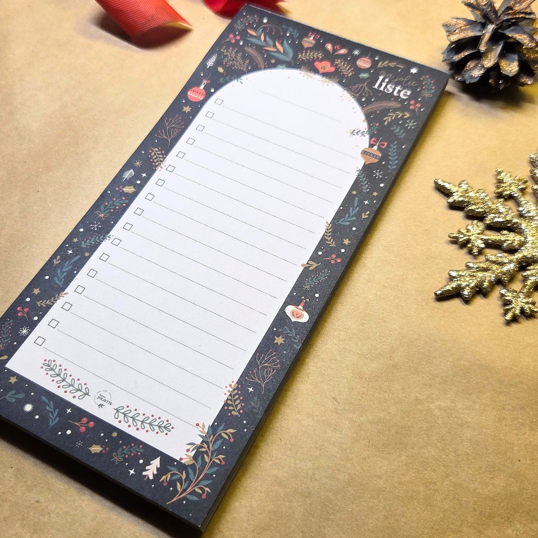 Tämä 10 x 21 cm kokoinen muistilehtiö tuo ripauksen joulun tunnelmaa arkeen. Sen kaunis, jouluinen kuvitus ilahduttaa joka kerta, kun nappaat lehtiön esiin – olipa kyseessä nopea muistiinpano, kauppalista tai pidempi lista muistettavista asioista. Pitkulainen muoto tekee siitä erityisen kätevän juuri listojen kirjoittamiseen: kaikki tärkeä mahtuu yhdelle sivulle selkeästi ja helposti luettavasti. Viivojen edessä on laatikko, joten kun olet saanut askareen tehtyä tai puutteen ostettua, voit rastia asian tehdyksi.